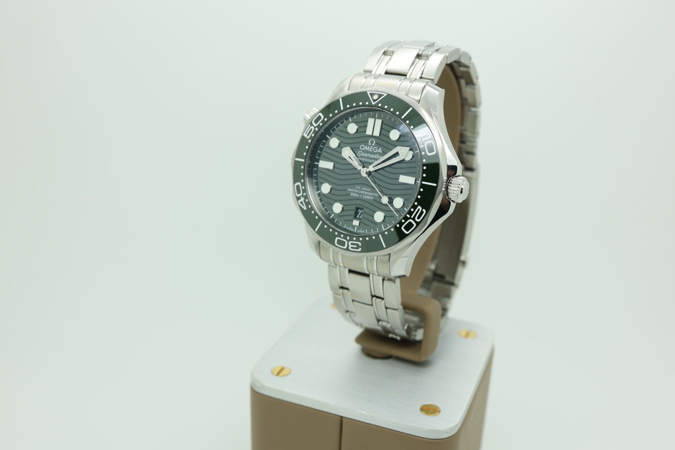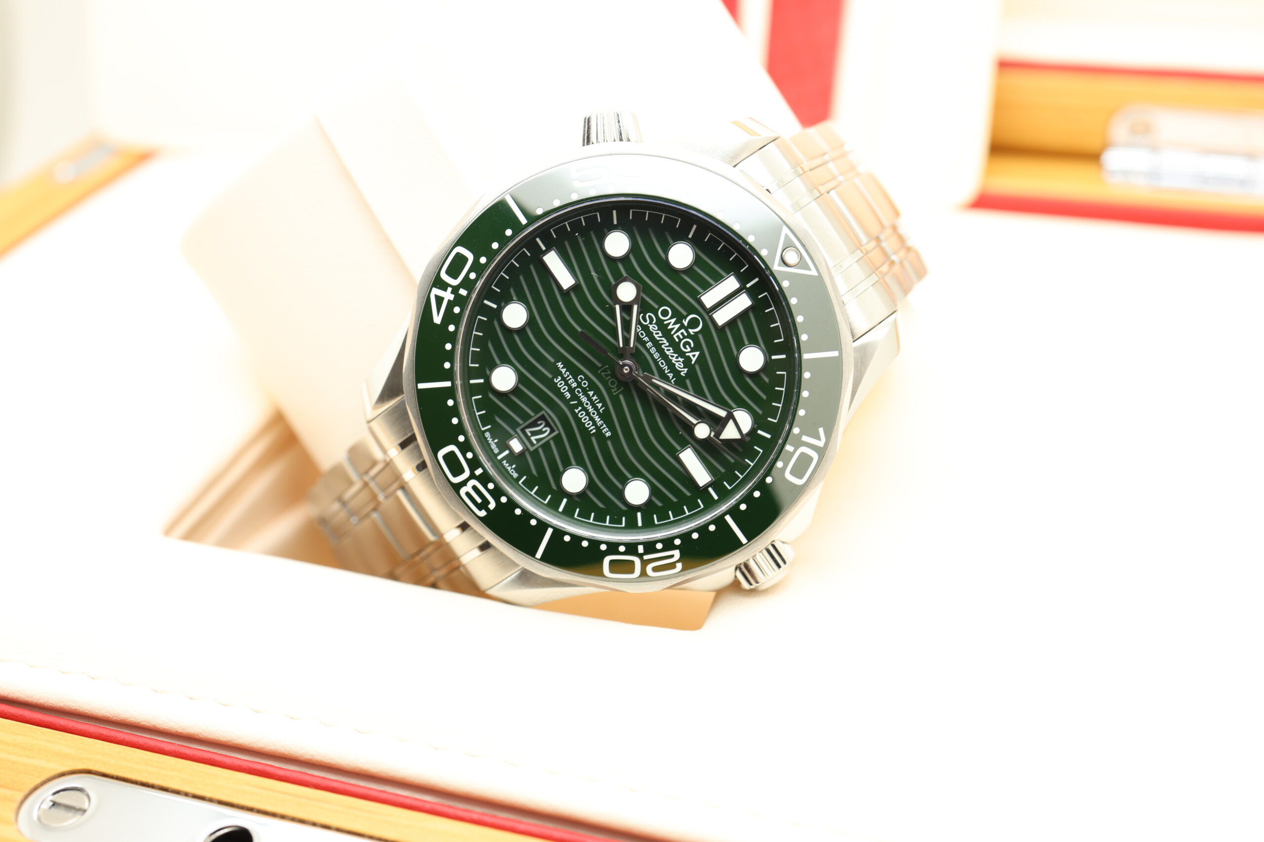 The Omega Seamaster Diver 300M in green is one of the most striking modern interpretations of Omega’s legendary dive watch, combining professional diving capability with a bold and contemporary colorway. The rich green ceramic dial with laser-engraved wave pattern shifts beautifully in different lighting, paired perfectly with a matching green ceramic bezel and stainless steel bracelet.