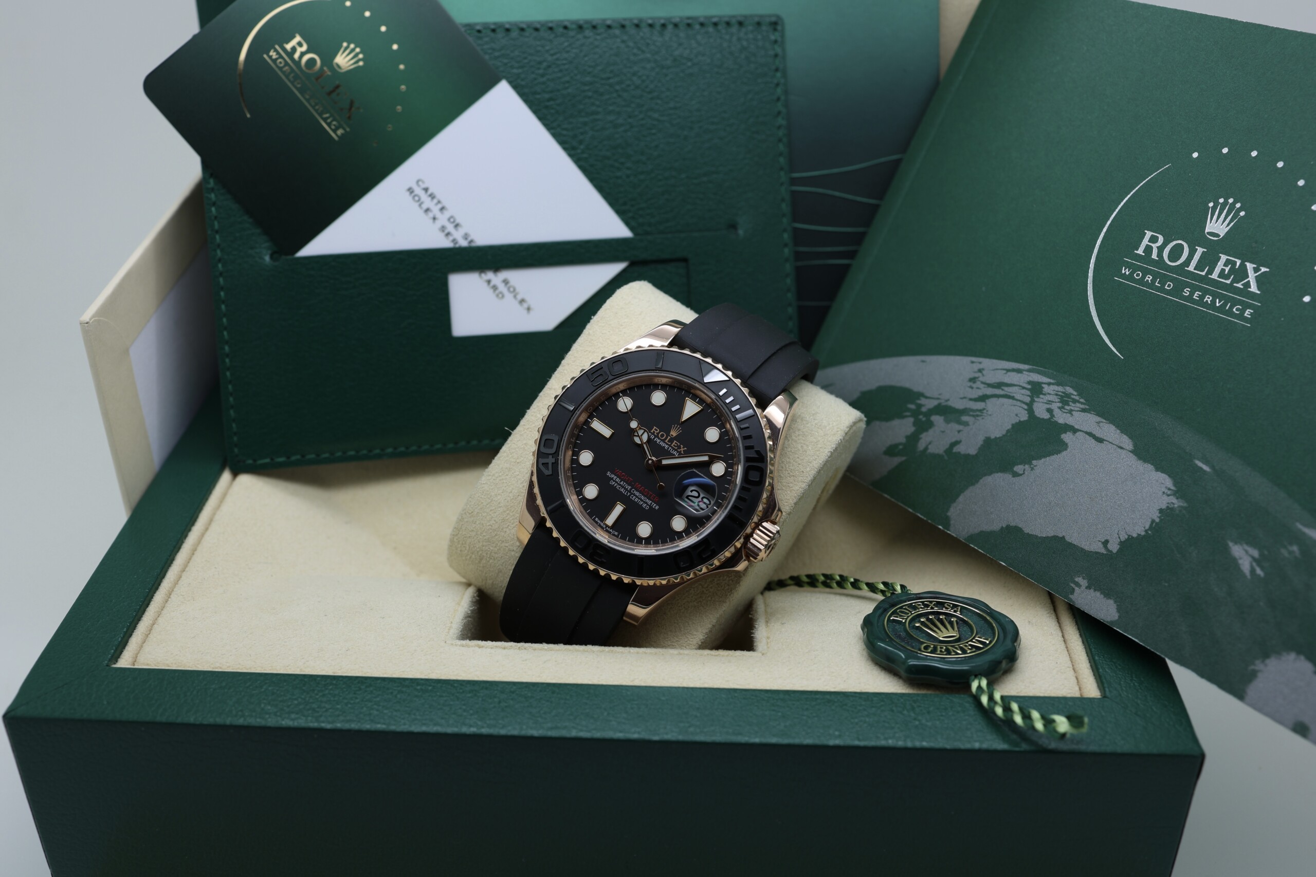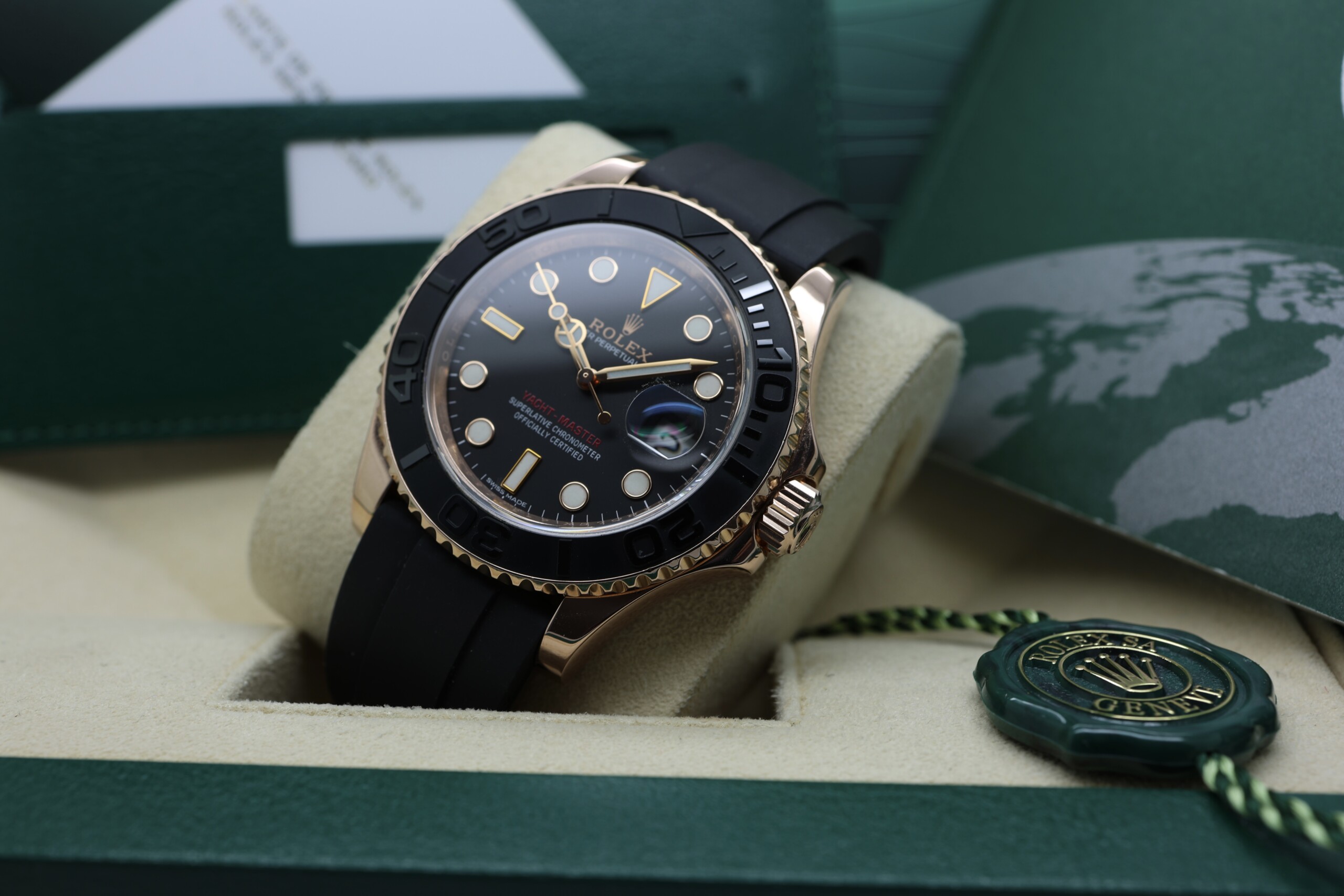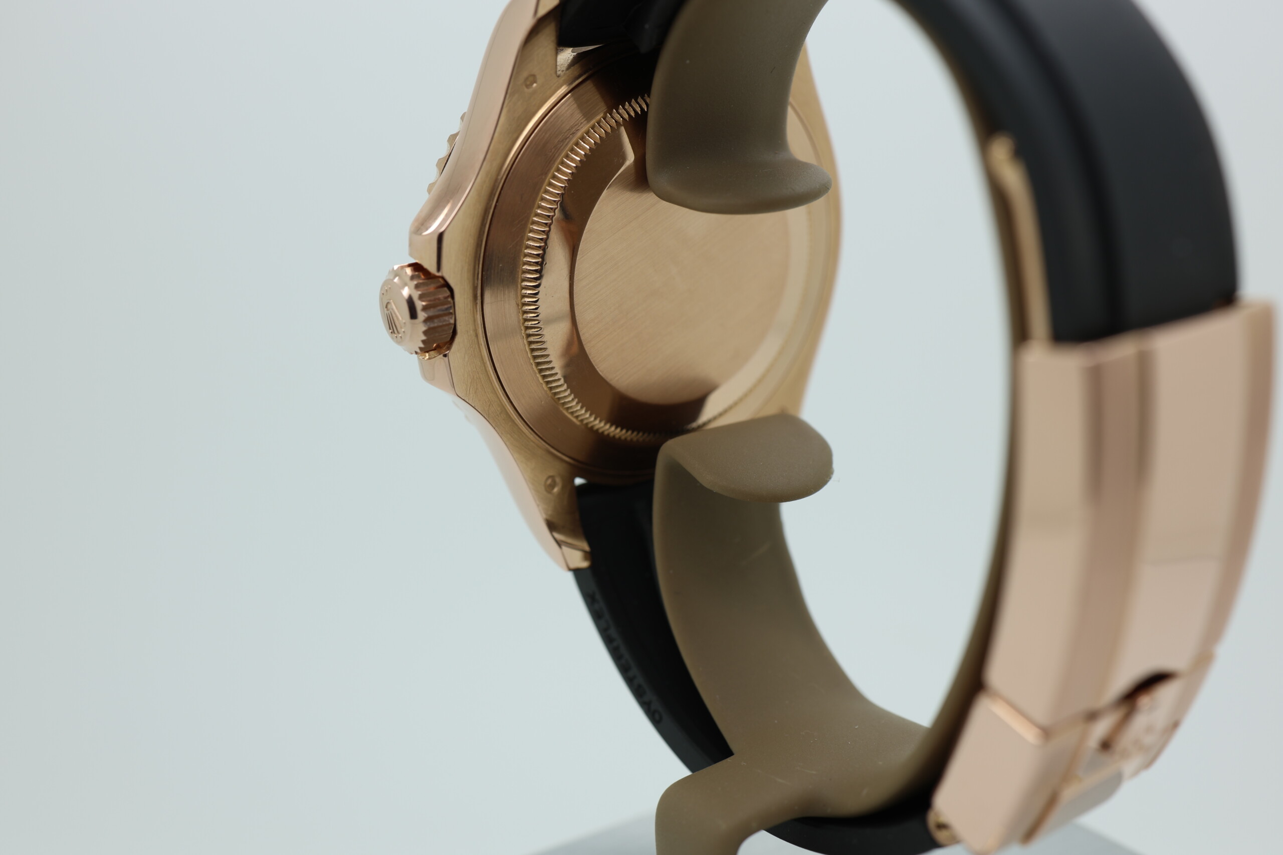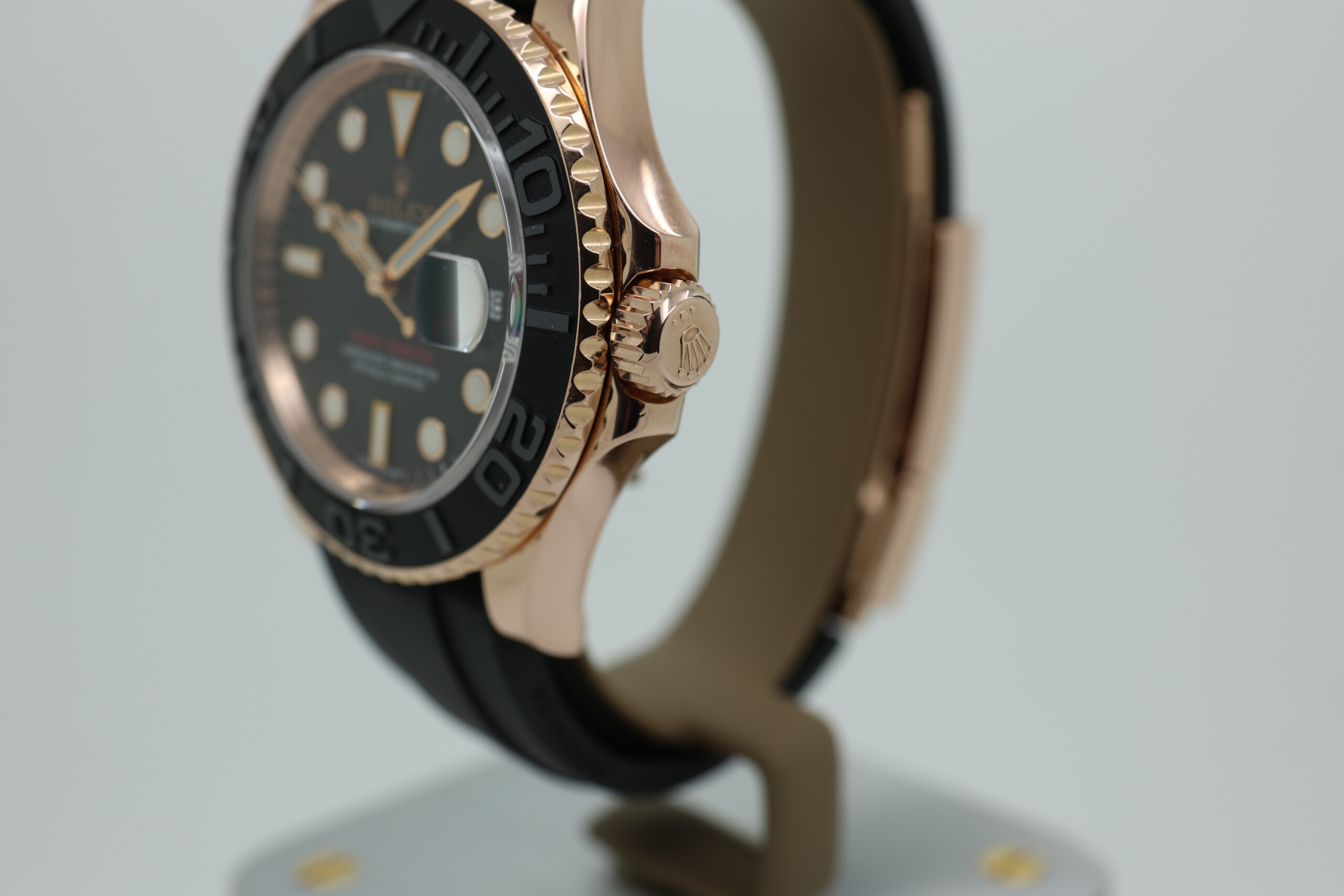 Powered by the reliable Rolex Calibre 3135 automatic movement, this Yacht-Master delivers exceptional precision and durability. The 40 mm Everose gold case offers a strong wrist presence while maintaining everyday wearability, and the Oysterflex bracelet combines the comfort of rubber with the robustness of a metal bracelet thanks to its flexible metal blade core. The raised numerals on the ceramic bezel provide a striking three-dimensional look while enhancing legibility.