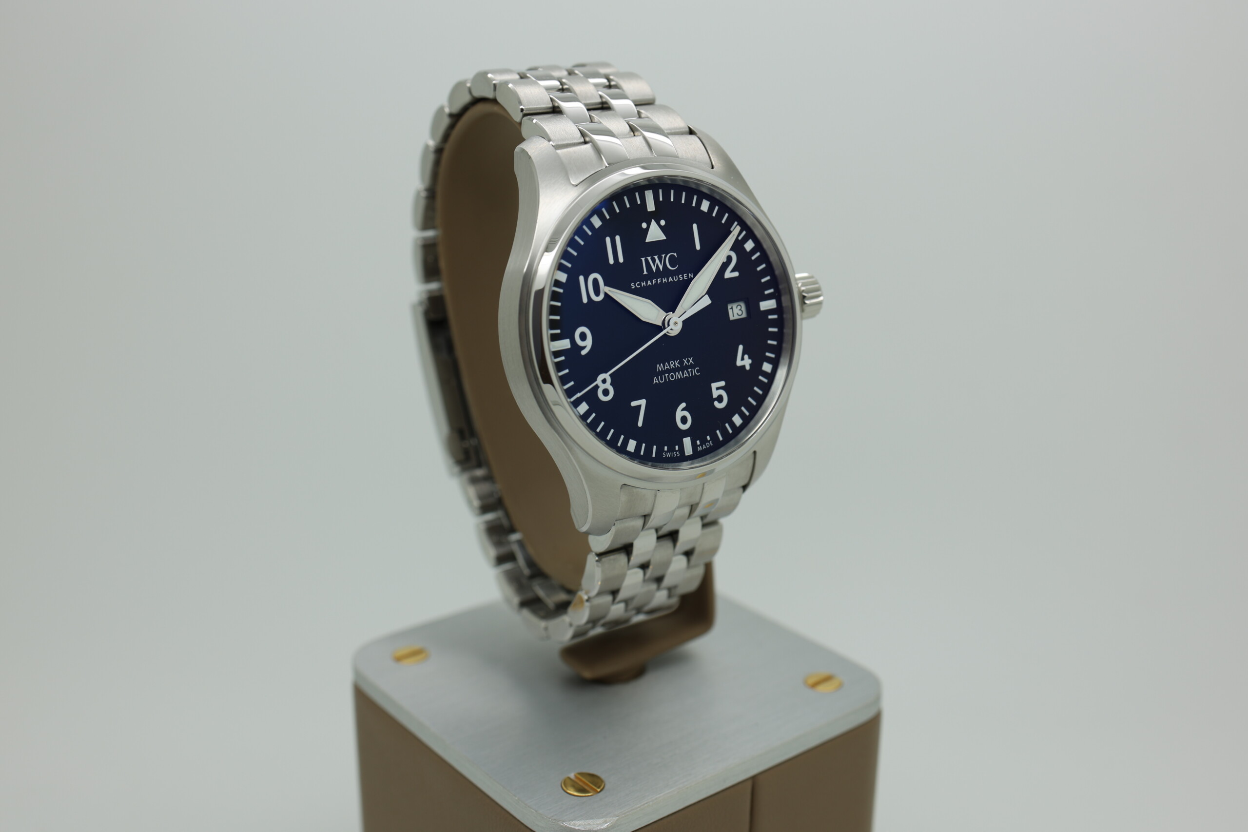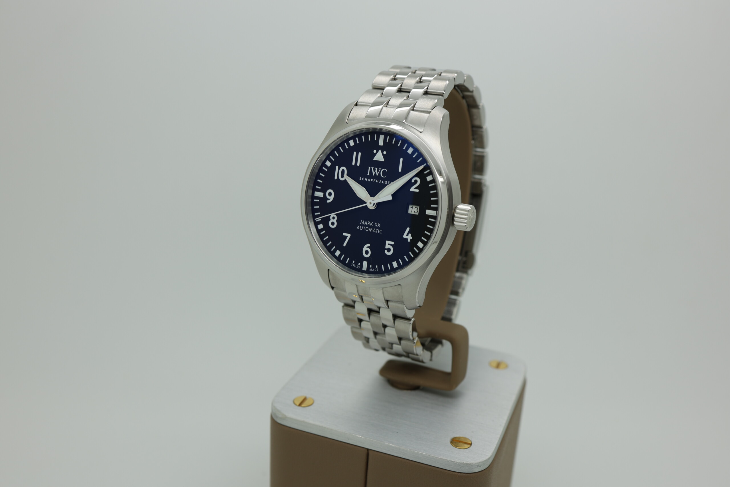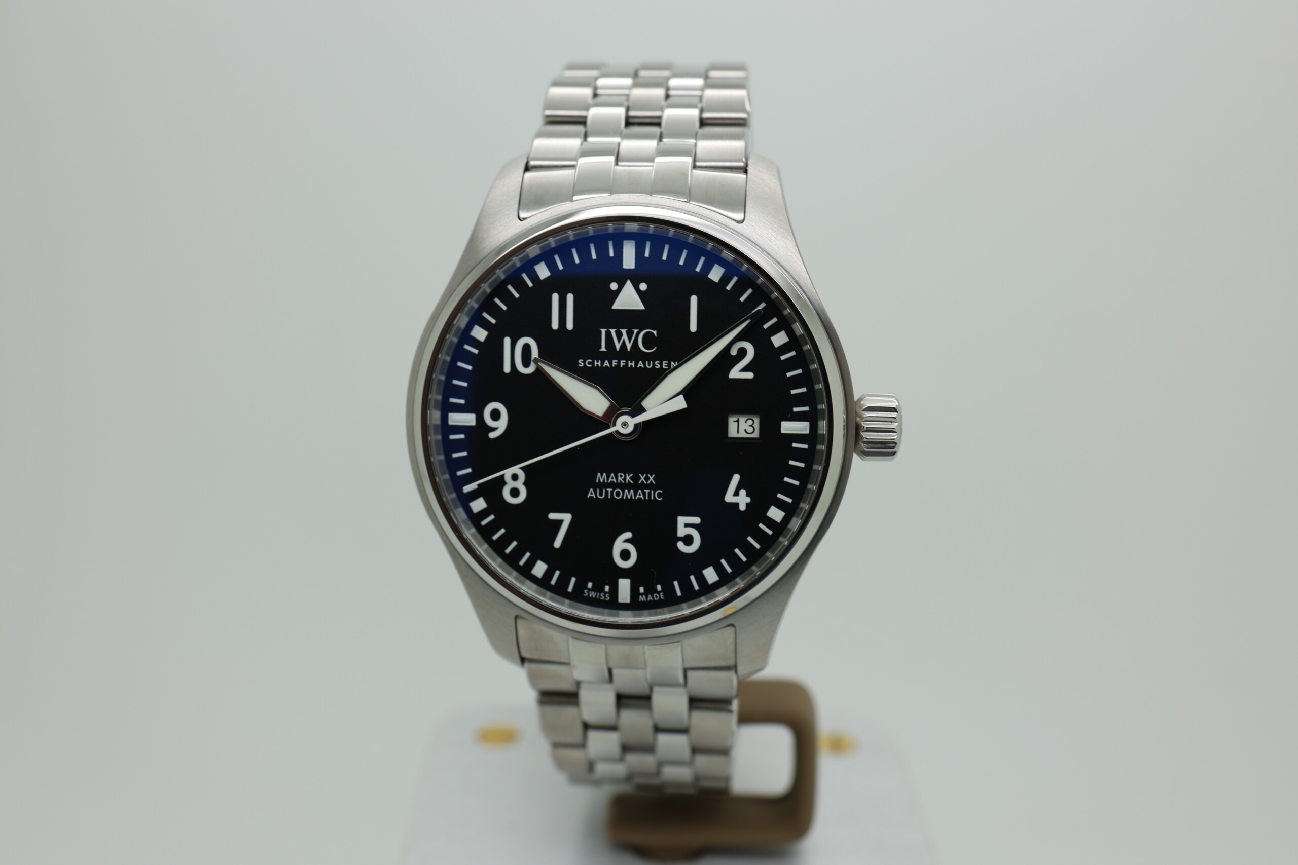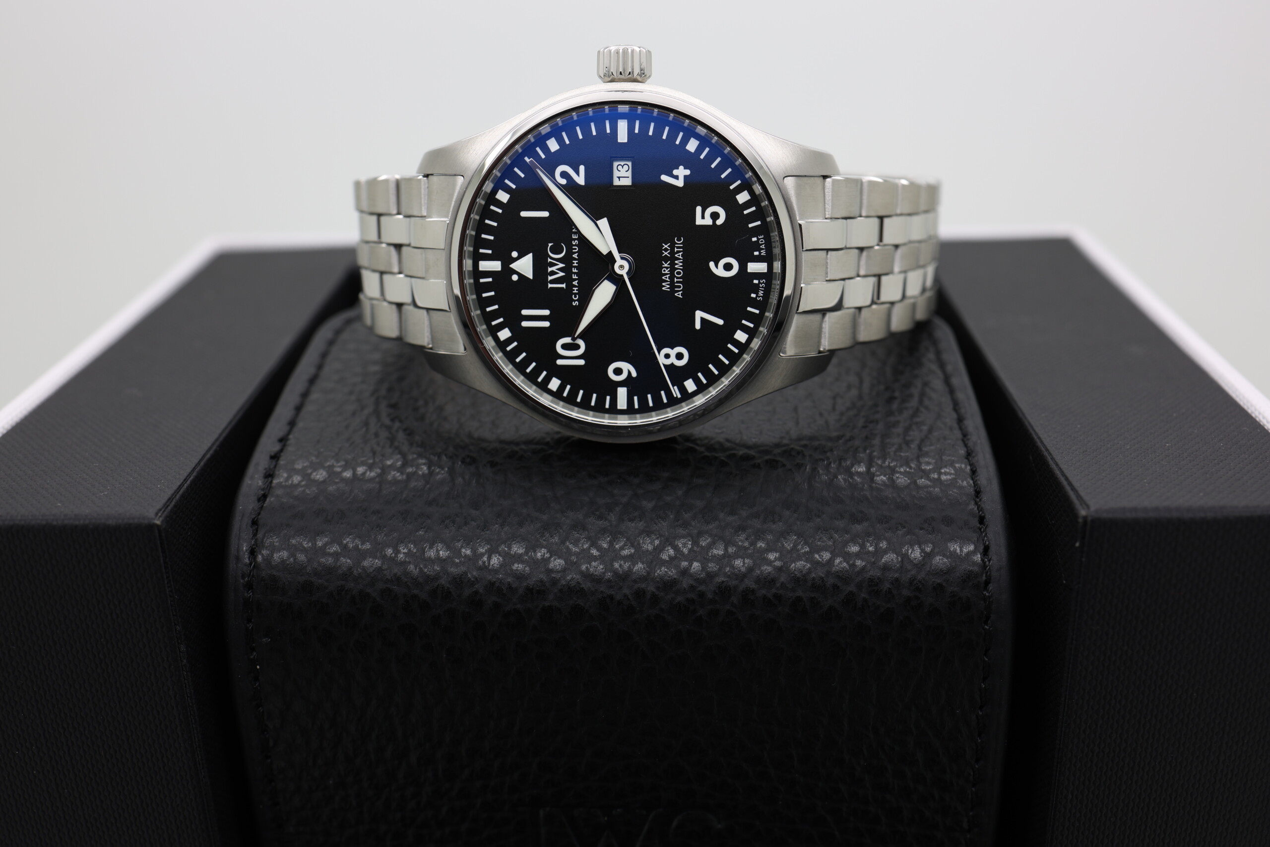 This 2025 example of the IWC Pilot’s Watch Mark XX (Ref. IW328202) is presented brand new and unworn, accompanied by its complete full set (box, papers, warranty, tags). Crafted in stainless steel with a 40 mm case, it features a black dial with high-contrast white Arabic numerals, luminescent hands, and the signature pilot’s triangle at 12 o’clock.
