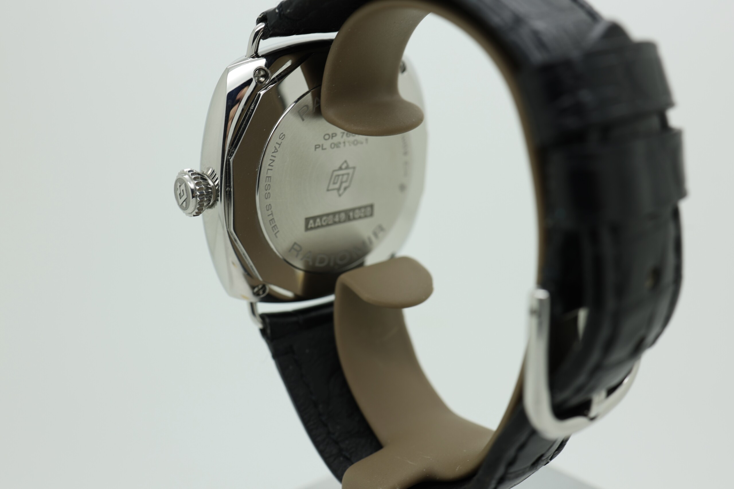 The clean, highly legible dial features classic Arabic numerals and baton markers, enhanced by luminous coating for optimal visibility in low-light conditions. True to the Radiomir DNA, the watch showcases a pure, uncluttered aesthetic that emphasizes symmetry and heritage design, making it a standout piece for collectors who appreciate understated luxury.